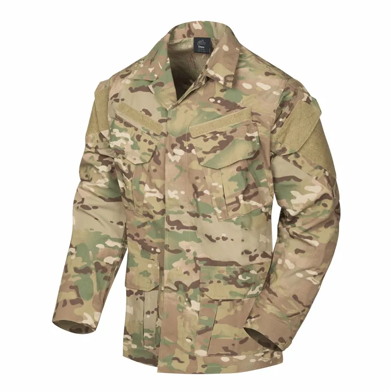 Bluza firmy Helikon w kroju SFU (Special Forces Uniform) wykonana z materiału  Policoton Rip-Stop (60% bawełna 40% poliester) co daje nam lepszą wygodę, lekkość razem z lepszą wytrzymałością. Jest ona udoskonalona względem poprzedniej wersji poprzez powiększenie paneli na ramionach (velcro) oraz dodatkowy panel velcro na kołnierzu, większe kieszenie i regulacje talii.. Bluza jest zapinana na guziki i posiada 6 kieszenie (dwie na klatce, dwie na wysokości bioder oraz po jednej na ramieniu) zapinane na rzep. Posiada wzmocnienia na łokciach, rękawy można regulować za pomocą szlufki, a końce rękawów są regulowane za pomocą rzepa.